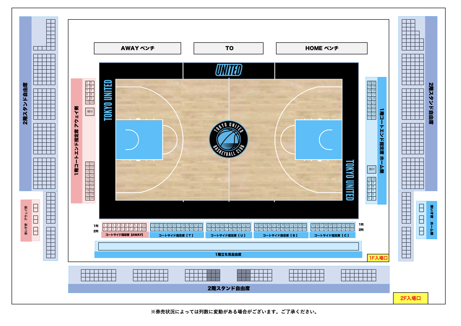 コートの前列付近のお席は、選手がプレーする際にやむを得ず飛び込んだり、ボールが飛んでくる場合があります。